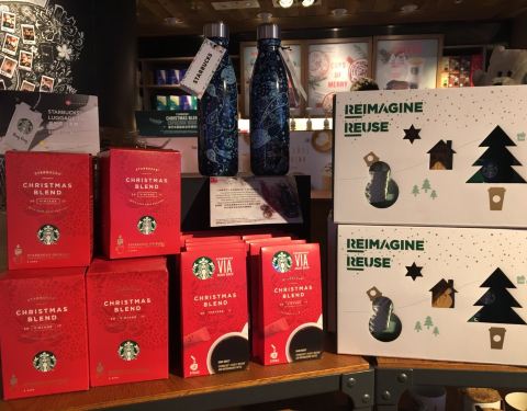 美丽华里面的星巴克是在中庭的位置。上面有超高的挑高空间,所以坐在这里的感觉非常的通透,一点儿都不会拥挤压抑。圣诞节前推出的保温瓶,像红酒瓶那样的形状,但是瓶身全包膜,印有星巴克标志性的logo,以及腰...