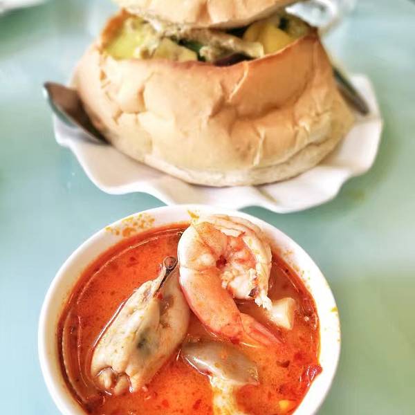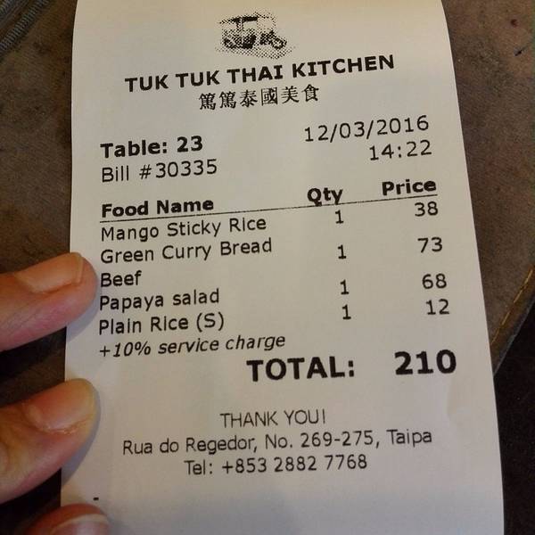 快速通关后,我们坐上了去银河的穿梭巴士,因为官也街就在银河不远的地方。抵达银河后,我们利用离线地图步行到氹仔官也街(大概10分钟)~在去的路上,我们碰巧遇到了这家笃笃泰国美食,其实之前在大众点评上看到过这家,是五星推荐,所以既然路过,那就试试~毕竟当时已经是下午2点了! 结果……一试之下,满满的都是惊喜~ 可能是因为我们到的比较晚,店里的人并不多,就2桌。餐厅布置很简朴,但确实很有泰国小清新餐厅的感觉,到处都有tutu车的画或者模型。餐厅的服务员有的是泰国人,连放着的歌和哼唱的厨师都是泰语的,所以正不正宗?你们觉得呢?至于我自己的品尝体验,仅从我们点的3个菜来说,是我在大陆+香港+澳门吃过的最正宗的泰国味道。 先上图~餐厅门面~青咖喱牛肉面包(78葡币)~咖喱有黄咖喱红咖喱和青咖喱可以选择,也可以选择不要面包,然……面包和咖喱可是绝配!青咖喱微辣,不会太稀,味浓,里面的茄子和一种我不认识的青豆,我特别喜欢。而咖喱汁浸透在了面包里,特别美味!牛肉也不会老,反而是嫩嫩的口感,又被咖喱所融合!至于那个面包则外面烤得焦焦的,里面却很松软,一吃就知道是自己家做的,不是外面买回来的那种~另外,上菜时还会配上剪刀,一个细节足见其贴心!面包和咖喱是绝配~这个豆子不是我们普通吃的青豆,味道有点苦苦的,是什么豆?有人知道吗?!另外,他家在上饭的时候是用盘子上的(图片是我盛出来了),这真的是泰国人的吃法呀~冬阴功汤!!!!味道绝对五星!!!酸甜辣都是泰国正宗的味道!回味无穷~青木瓜沙律一直是我的挚爱,但在广州我真的没有吃到过让我满意的,这家沙律大家注意了,有配生豆角,这是正宗青木瓜沙律必须有的材料,青木瓜丝爽口,虾很新鲜,配上柠檬汁,这会是夏日里最受欢迎的一道菜!而且这个沙律分量奇大无比,咸淡酸可谓刚刚好!好吃得停不了口呀~芒果糯米饭又是我的另一个对泰国的执念,每一次去THAILAND一定要吃N次!这里的糯米口感极佳,甘糯可口,芒果的果味十足,口感细腻顺滑,而椰汁做得是最好的,那甜中微微的咸味恰到好处!让我感觉自己好像身处泰国~芒果糯米饭:38元 青咖喱牛肉面包:73元 青木瓜沙拉:68元 米饭:6元/个 冬阴功汤:忘了。 以上是澳门币哦~不是人民币。 上面有地址和电话哦~综上所述,这家餐厅的味道真的非常正宗且一流,而且价格亲民,和广州中高的泰国餐厅价格相当~在此强烈推荐,下次去澳门,我一定还会再去~! 地址:氹仔地堡街269-275号泉福新邨地下(近市政街市) 电话:+853-28827768 营业时间:12:00 - 00:00