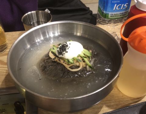 这家位于明洞,是24小时全天营业的,适合去旅游的小伙伴们,主要味道也不错~他们家牛肉是精选的,可以看出来的。还有个海鲜葱饼也很好吃,烤肉就更不用说了,很好吃,在明洞逛完,深夜去这里吃顿烤肉,小酌一杯,就完美了。里面的环境也很棒,给人很舒服的感觉。里面的服务生都很热情,一看就年纪不大的兼职生,都很可爱。喜欢烤肉的小伙伴们,去了首尔,可以去看看~吃完烤肉可以像我一样吃碗冷面!