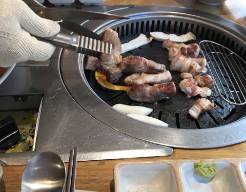 我们点了一份牛肉,两份五花肉,还有海鲜煎饼,不得不说真的很贴心,帮我们烤肉,而且味道真的赞
