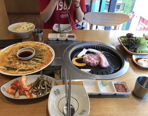 - 我们点了一份牛肉,两份五花肉,还有海鲜煎饼,不得不说真的很贴心,帮我们烤肉,而且味道真的赞
