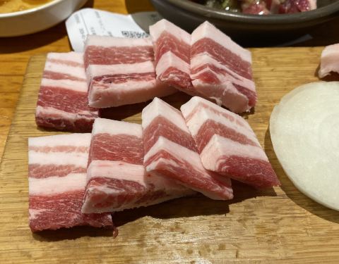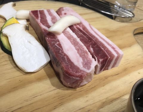 点了他们家最出名的五花肉 还有帅帅的店员小哥哥帮我们去烤肉 真的太棒啦 哈哈哈 店员小哥哥中文不是太好 不过反正也没什么需要沟通的啦 只要负责吃就行 菜单上面也有中文 比较方便游客点单 嘻嘻 店在明洞4⃣️号线6号出口 自然乐园最大的总店对面三楼 很好找到哦