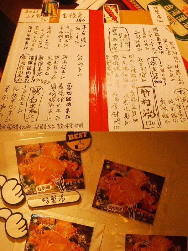 《我可能不会爱你》拍摄地 菜单~推荐竹村烧~四个人花了1095新台币 类似章鱼小丸子的味道 里面有起司和玉米 螃蟹味增汤好咸...还点了鸡肉串干贝烧秋刀鱼蛋卷烤白菜so on实话味道一般。。