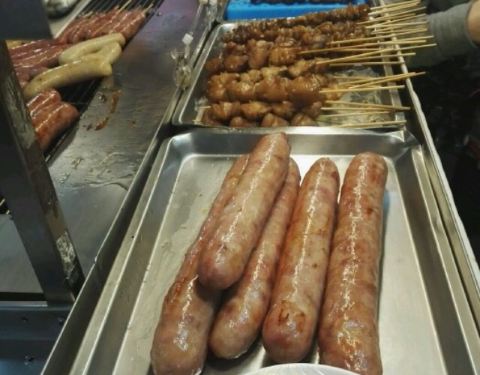 大肠包小肠将肉和糯米的香味融合在一起经过烤制又香又脆,烤肠现点现烤远远的就能闻到香味儿趁热吃味道一流