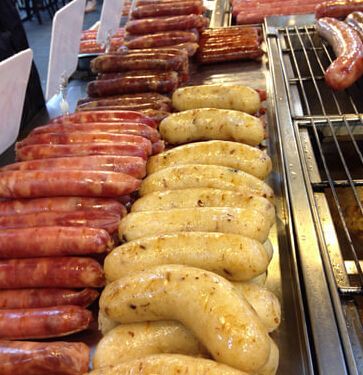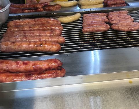 每天新鲜现灌的大香肠,香烤现煎后,会发出香香的味道,红润好吃模样,加上带有辣劲的蒜头,那股香辣...