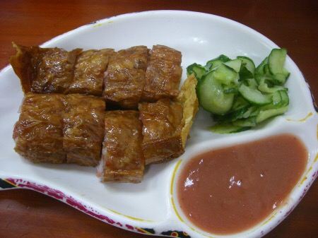 终于在排了近20分钟的队伍后,买到了龙缘五香肉卷。暂且不去评论它的外表,狼吞虎咽了几块之后,不得不谈谈它的巨大诱惑力。放到嘴里,首先第一感觉是外层的一圈皮,特别香脆,咬下去便品尝到里面瘦肉的那种鲜嫩感觉,软软的特别易嚼烂,伴着添加的一点酱料,不愧是外焦里嫩,好吃!