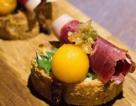 酒吧气氛蛮好的,鸡尾酒的味道很正!提供Bruschetta這種西班牙小酒館常見的小點,法國麵包切片上擺佐料食材。我們點的是老闆推薦的伊比利火腿,搭配一小球哈密瓜,底下墊上一片芝麻葉,外觀漂亮但食用起來比較不...