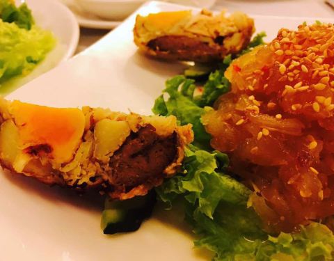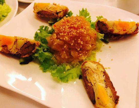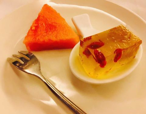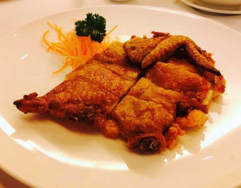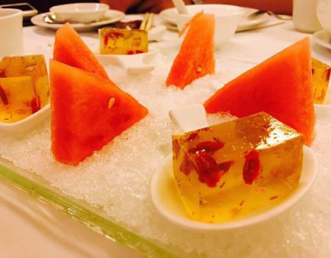 金龙百花鸡又香又嫩; 桂花炒生翅,鱼翅像桂花一样,搭配鸡肉、鸡蛋、豆芽,用生菜包裹着吃,很新奇; 酥炸蟹烧凤肝拌海蜇赏心悦目,一点都不腻; 传统薄饼和扬州炒饭量真的很足,不用担心吃不饱; 枸杞桂花糕和西瓜来结束完美的一餐。