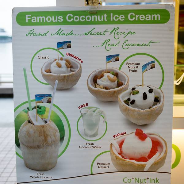 甜品铺就在滨海湾,看完鱼尾狮后,走过一座桥右拐就到。去年我无意中吃到满是惊喜,今年带领着两个小伙伴再去光顾。椰子壳内躺着椰子味的冰淇淋,上面淋上不同的辅料,附送椰子肉和椰子水。