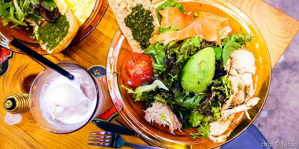很老式的门面,法国人开的餐厅,比较浪漫,而且做事很认真执着,菜色选择多,汉堡很大一份,沙拉有很多不知名的蔬菜,除了咖啡还有酒,菜放木板上,很占地方喔。