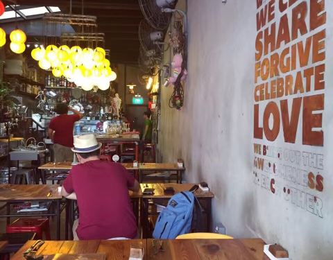 在“中华医院”原址开设的真棒堂咖啡馆,不但保留始建于1952年的旧中医馆的原貌,还将中式复古元素融入装修和设计中。 热气球造型纸灯笼、针灸模型和中药柜,与工业风钢管桌椅、钨丝灯和打印机字体菜单,混搭出粗...在“中华医院”原址开设的真棒堂咖啡馆,不但保留始建于1952年的旧中医馆的原貌,还将中式复古元素融入装修和设计中。 热气球造型纸灯笼、针灸模型和中药柜,与工业风钢管桌椅、钨丝灯和打印机字体菜单,混搭出粗犷杂乱又华丽丽的美感,大受欧美游客的欢迎。