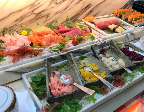 丽丝卡尔顿酒店餐厅,晚上大部分是自助,也有部分档口需要排队自取,日式档口不管哪国的自助餐都是热门区,不想凑热闹跑没人的意式区去弄了份意面,意料之外的好吃。