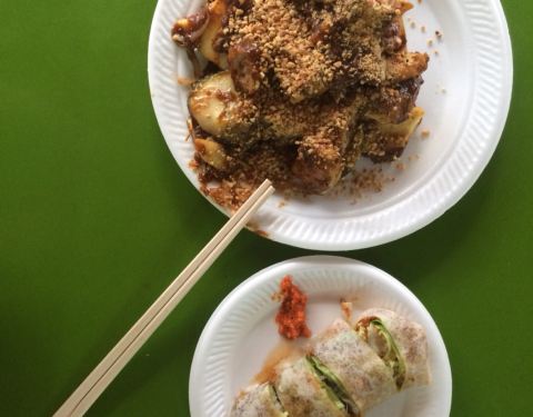 The rojak is made with a thick, nutty sauce. The popiah must be had with the chilli.