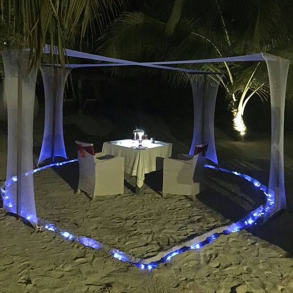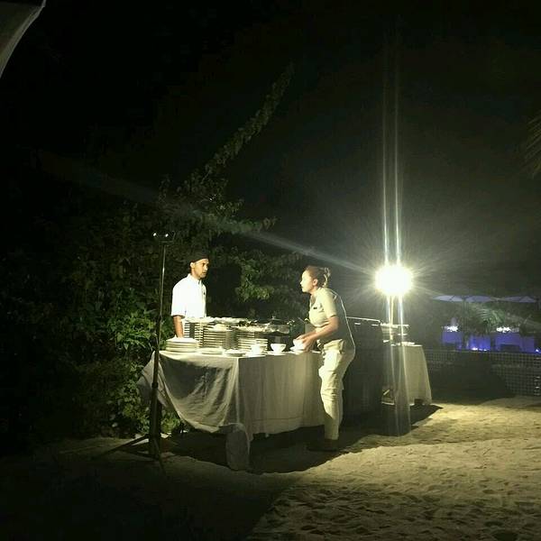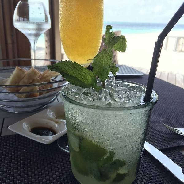 这几乎是我最喜欢的一家餐厅,比较美式,有汉堡、牛排、三明治、披萨和龙虾等等。重点是,酒超好喝!!因为是有bar的,而且料都非常足!!而且对面就是最适合浮潜的海沟,浮潜累了就可以上来吃吃喝喝!!!本来我们的烤肉大餐不应该在Meeru bar吃,但是因为时间的关系,可爱的BUNNY小姐帮我们把BBQ定在了Meeru bar,而且还是做了精心布置的私人晚宴。比心比心