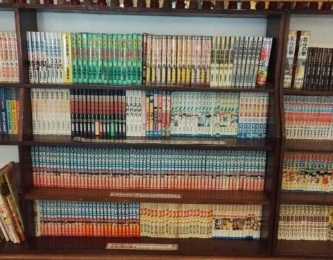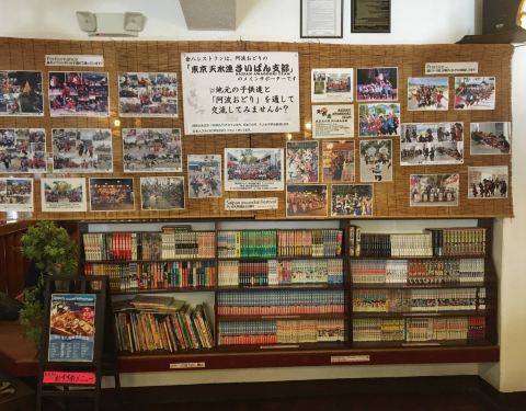 ...对面,开放式厨房,可看到厨师的制作,有一柜漫画可随意翻阅,点了三文鱼套餐和牛肉套餐,花费35刀