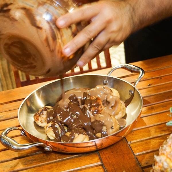 美女给我们推荐了今天捕获的一种鱼,说非常的鲜美。正吃得开心,主厨端着个巧克力盘子出来做甜品