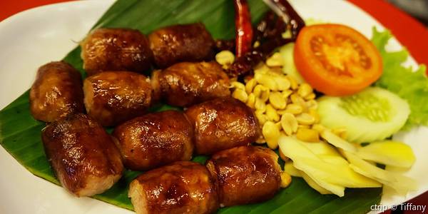 这家店的特色就是泰国的猪肉香肠了,品种很多,随便要了两种,那个像午餐肉一样的香肠没想到很好吃,烤的反而一般般,青瓜丝里面也有香肠。