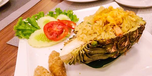 餐厅位于考山路上,外面看着很普通,穿过一个巷子,里面别有洞天,露天院子是酒吧,再往里面才是吃饭的餐厅。冬阴功汤酸辣可口,菠萝炒饭味道甜甜的,加上泰国大米特有的香味,让人赞不绝口。
