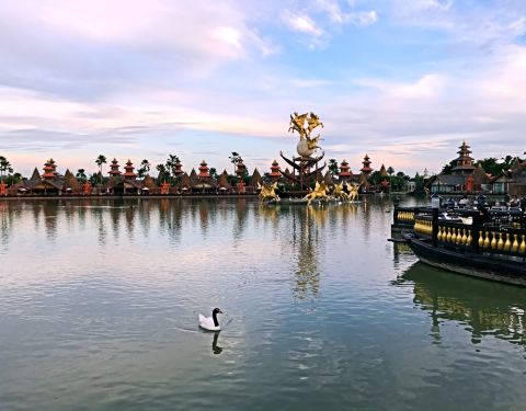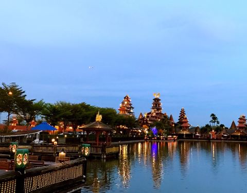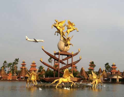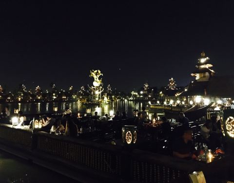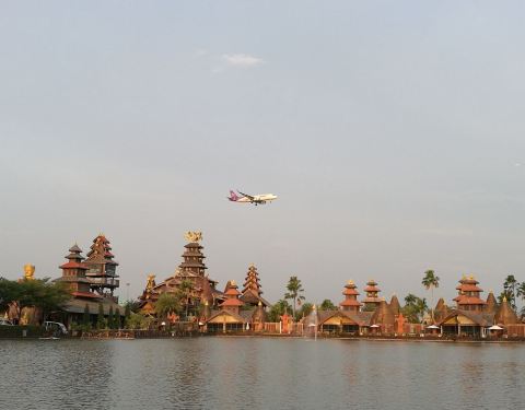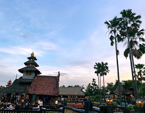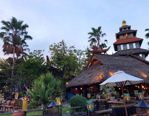 建筑将泰国与巴厘岛的风格相融合,餐厅中的绿树和湖水也增添了一份东南亚风情。因为靠近机场,所以用餐期间能清楚地看到飞机降落,也别有一番趣味。餐厅供应地道的泰国料理,美景配上美食更加让人心醉。