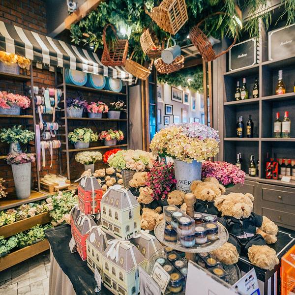 天花板上垂吊的花篮,马克龙色的欧式装修,让人仿佛走进一个秘密花园。店内的招牌是花盆蛋糕,蛋糕做成鲜花…