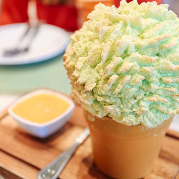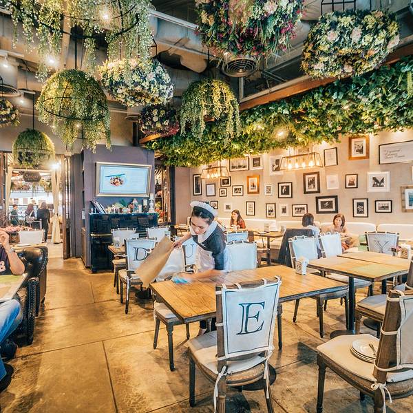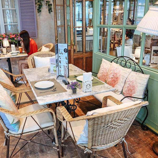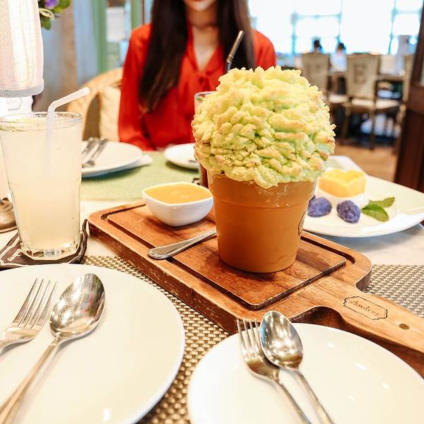 天花板上垂吊的花篮,马克龙色的欧式装修,让人仿佛走进一个秘密花园。店内的招牌是花盆蛋糕,蛋糕做成鲜花的形状,摆放在小花盆中,既好吃又好看。除了甜品之外,意大利面也是食客热点的菜肴。