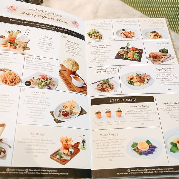 高颜值网红餐厅,蟹肉也能做成舒芙蕾 作为曼谷的网红级甜品, 那Audrey绝对是不得不提的! Audrey的创始人是泰国女明星Bam, 从2011年第一家店开业到现在, Audrey在曼谷已经有7家连锁店。 Audrey这个名字, 也是在致敬大名鼎鼎的女神Audrey Hepburn(奥黛丽赫本)。Audrey在曼谷的商圈几乎都有, 每一家店风格完全不同, 尤其是EmQuartier商场的Audrey餐厅的风格绝对独树一帜!Audrey Cafe' des Fleurs 全部都是采用欧式花园的装修风格, 少女心爆棚的宝宝走到门口就肯定迈不开腿。 不管是门口, 还是餐厅内部, 这里已经成了曼谷少女们的拍照必须打卡的一站。一进门, 门口布置的的花花草草就已经是美翻了的水平。 不知道的还以为是到了花店。再往里走, 简直就是走进了花园一般。 到处都充满了植物, 实在很赏心悦目。屋内的细节也做得非常棒, 各种小摆饰足够吸睛。靠窗边的区域, 一直是各路人马的大爱。 从这里可以俯瞰曼谷高空景色。更加特别的, 是靠里的一个区域。 这个区域完全布置成了一个欧式小花园。作为曼谷拍照圣地之一, 花园区域一定要避开人流高峰期来, 太多人就是冲着这个区域来的。看完环境, 还是回归主题看看吃喝。 他们家的价位算是合理水平, 饮料大概就是100B左右的水平。 所以说, 来曼谷一定不要错过大大小小的甜品店, 国内的甜品店实在性价比太低了。柠檬水是在泰国永远不会选错的饮料。 泰国特产青柠, 酸度非常高, 喝起来口感不会腻。泰式奶茶也不要错过, 就算是街边的泰式奶茶, 水准也非常高。 泰式奶茶主要以红茶作为基调口味, 再配合炼乳和奶油, 二小姐也经常自己做的。蟹肉舒芙蕾,320B。Audrey的招牌之一, 就是这道颜值非常高的蟹肉舒芙蕾了。 造型实在太夸张, 绝对是朋友圈吸睛利器! 舒芙蕾源自法国, 先将蛋白打匀,再放入蛋黄和其他不同配料, 经过烘焙火候,内部会充满气体, 表面就不可思议的膨胀了起来。不同于以往常见的舒芙蕾偏甜的口感, 蟹肉舒芙蕾的配料当中加入了蟹肉, 整体偏咸。这道蟹肉舒芙蕾还加入了芥末和芝士, 不习惯吃芥末的宝宝们要慎重选择。蘸酱芝士味道很浓, 绝对是芝士控们的爱。舒芙蕾的口感就像是在吃棉花糖, 混合蟹肉, 整体口感搭配就很丰富。芒果糯米饭,190B。他们家的芒果糯米饭造型也是华丽到惊人。 端上来的时候是用玻璃罩子罩着的, 里面笼罩着香料味十足的烟雾。 揭开盖子,烟雾散去后, 你就会感叹, 竟然大街小巷都能吃到的芒果糯米饭也可以做到这样精致。芒果都是削成薄片, 拼成了花朵的形状放在椰子布丁上, 紫色的糯米饭做成了叶子形状。不只是造型惊艳, 吃法上也和传统的芒果糯米饭有一些区别。 传统的芒果糯米饭会淋椰浆上去, 但是在这里用椰子布丁代替了椰浆。 口感完全不同,各有千秋。这个下午茶吃得那么造型夸张,两道甜品,两杯饮品,一共803B。 国内的话,至少是价格X2的水平。 餐厅环境和服务都很好, 这些也是Audrey Cafe des Fleurs的加分项! 环境评分:9分 菜品评分:8分 性价比评分:8分 人均消费:80元Audrey Cafe' des Fleurs – 地址:The EmQuartier, 8th Floor, The Helix Quartier – 交通方式:BTS到Phrom PHong站,步行到旁边的The EmQuartier商场 – 营业时间:11:00-22:00 – Map: