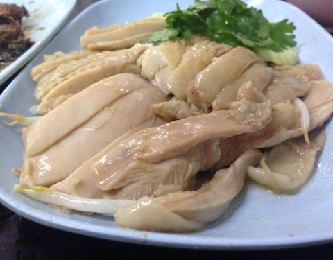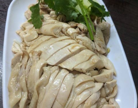 超级喜欢素坤逸这个区域,很多吃喝的地方,酒店也蛮喜欢的,所以来曼谷我一般都住这个地段,熟悉且比较方便。这家是做新加坡鸡饭的,不知道老板是不是南洋人。看看环境还行,淡紫色的,就进去吃点坡国的白斩鸡。...超级喜欢素坤逸这个区域,很多吃喝的地方,酒店也蛮喜欢的,所以来曼谷我一般都住这个地段,熟悉且比较方便。这家是做新加坡鸡饭的,不知道老板是不是南洋人。看看环境还行,淡紫色的,就进去吃点坡国的白斩鸡。都是调味好的,很嫩,鸡肉不错吃,点了一份不要米饭的,加了啤酒,估计这几天喝下来要啤酒肚了。 另外还送了一碗汤,没啥特别的味道,反正又不吃米饭。蔬菜就是空心菜,加了蒜头炒炒还挺好吃的。煎的香菇有点偏干,吃了一半就腻了。