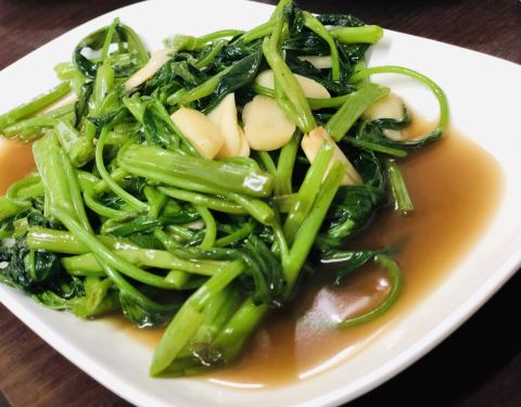 - 蔬菜就是空心菜,加了蒜头炒炒还挺好吃的。煎的香菇有点偏干,吃了一半就腻了