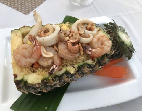 味道还不错。两人点了一份海鲜套餐320元RMB+税,有炒饭、海鲜拼盘、冬阴功汤、蔬菜汤、水果。 都很好吃。蛋炒饭也很赞。海鲜拼盘超级赞!大份,什么都是双份的,有鱼虾蟹乌贼小管淡菜。又很新鲜! 吃得很撑! 强...