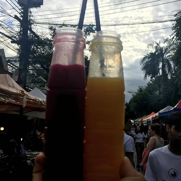 丛林飞跃回来,我们就直奔清迈的周日市场!清迈周一至周日都有夜市,但是最繁华的在周日,所以我们特地待到周日,就为了这盛大的美食夜市!!! 超级多美食!!!鲜榨的芒果汁和石榴汁。好喝!寿司!超级便宜,超...