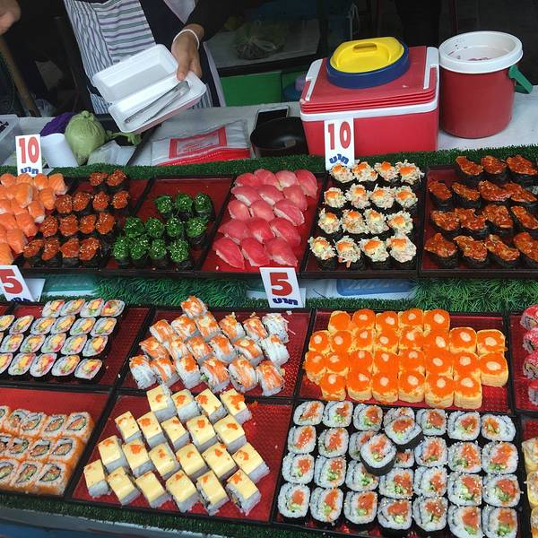 超级多美食!!!鲜榨的芒果汁和石榴汁。好喝!寿司!超级便宜,超级好吃!!!一定要多吃,不然你会后悔的!泰国手信烤玉米,烤香蕉。烤鸡排这个不知道是什么,感觉还行油炸类!新鲜椰子,主要看为了店主的刀工,赞叹不已!肉丸。我们没吃哈哈哈泰国手信果汁冰棍这个好像手工丝巾吧。