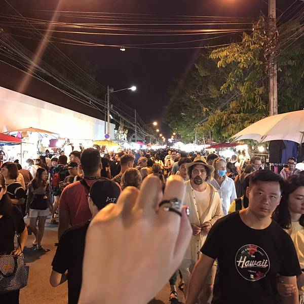 周日夜市不仅商品多,人更是多,基本都是小碎步缓慢前进,买了手工收纳袋打算用来装单反和胶片机,已经很便宜我俩还丧心病狂的讲了价,结果讲一遍就秒怂买单了呆霖穿越众多首饰一眼相中老板娘手上的花戒指,依然讲不动价29฿拿下,我非常喜欢,虽然拍糊了,但心里和裹了蜜一样甜周日夜市真的很有意思,不像其他夜市大多是重复类似的商品,这里非常多纯手工制作的孤品,很多可爱又有意思的小东西,光看着都觉得心情愉悦夜市的其中一个尽头刚好就在酒店路口,我俩转悠了几条街耐不住脚疼就回酒店了撸个猫,晚安~