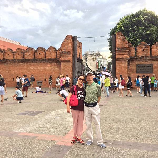【塔佩门】 清迈 最有名的一处城门,于1296年建成, 清迈 古城刚建成时,用红色砖块砌成的围墙高达两米,可惜经历岁月沧桑,现在只留下这道门了。听说周日夜市沿着这条路往北就是了。塔佩门前面有很多鸽子,可以买鸽子喂食,然后叫那个卖鸽子食的给你拍照,当时拍了一个五人合影的,此行程中唯一的合影,值得纪念呀。树上好多假芒果,我一直以为是真的