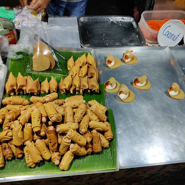 大概下午五点半到清迈,准备冲向周日夜市清迈的周日夜市可以说是整个清迈最热闹和规模最大的夜市了,大到没朋友。整个周日夜市从塔佩门开始到契迪龙寺结束。我和妈妈两个人从五点半开始自塔佩门出发,往终点一路上逛吃过去,到十点半我们两人已经筋疲力尽,才刚刚把主路的夜市逛玩,更别提还有很多的岔路延伸出去的地方。和周六夜市比起来,周日夜市更偏向于购买特产、服装和各类手工艺产品,美食摊位相对较少。但有个泰北凉拌粉丝着实让我惊艳。没错,就是这个粉丝,据说老板娘是厨艺学校的老师,只有周日夜市出摊,凉拌的酸辣味出奇的好吃,至少要等十几分钟才能吃到。回国后一直心心念念。