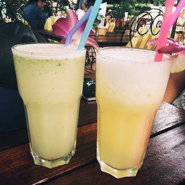 今天就要离开清迈了,早上出门太晚,找到计划中的早餐店时已经变成了早午餐。 店名是清迈早餐世界,德国菜。 整个店一半室内一半室外,室外的部分被几棵大树的枝叶覆盖,抬头就是一片绿意,实在是美极了。 就是在森林里用餐一样。 整个店的氛围也很棒,全是低声交谈安静享受美食的客人。我们去的时候中国人只有我们,其他都是欧美人和泰国本地人。进门后随意找了一张小桌子坐下,服务员送来了菜单。 这里的菜单真是艺术啊,花花绿绿的照片,看得我每样都想吃。正看着菜单,老板出来问我们要不要换到对面那张大桌子,真的是贴心我们坐的位置桌子确实很小啊。 忙着吃只拍下了一张餐厅内部的照片。 相信我,餐厅比这好看一百倍,我是为了吃饭没顾上拍照才这么胡乱的拍了一张不怎么好看的。一人点了一份早餐,分量真的超级足,撑死了。一杯柠檬汁,一杯菠萝汁。 柠檬汁是真酸爽啊
