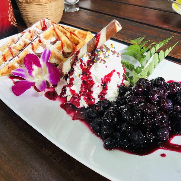 - 吉安的早餐,蓝莓搭配华夫饼和奶油,开心的早餐时间。直奔而去,环境真的非常惬意,舒适。羚羊角一样的植物