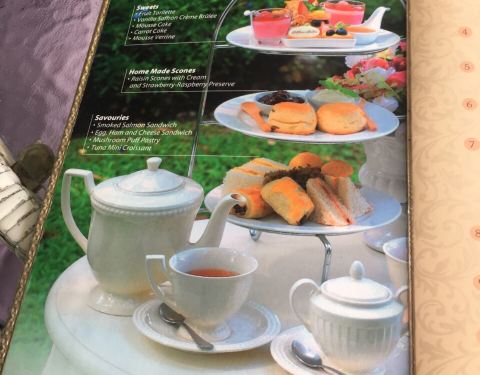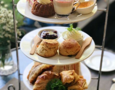清迈一家网红下午茶店。位于一座萍河边上的酒店。地方不太好找。餐厅连着一座漂亮的热带植物花园,有小型喷泉。室外的座位就摆在河边上,视野还是不错的,可惜就是萍河的水是黄黄的,缺乏美感。点了下午茶套餐,价格是1070铢,不含税。茶可以自选,要了英式红茶和绿茶。三层的点心笼子。从下往上吃,三明治和三文鱼挞不错。中间一层的司空饼只有两个,好在配果酱和鲜奶油味道还不错。最上面一层有五六种甜品。巧克力蛋糕、焦糖布丁、马卡龙,水果挞,五颜六色,卖相佳,味道可口。价格很合理。这里也提供西餐和泰餐,吃顿正餐也不错。