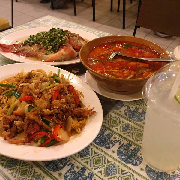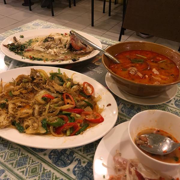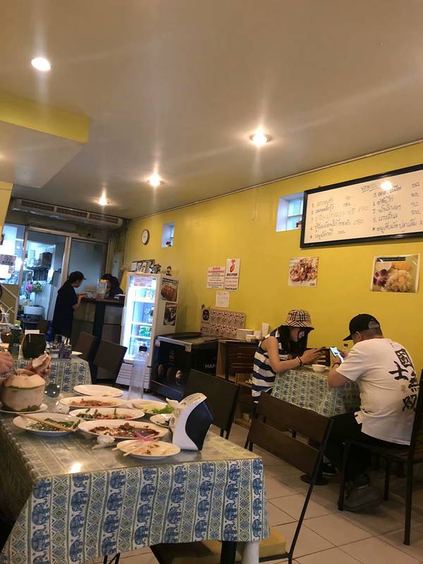 这家也算是一家老字号的餐厅了。里面的装修主要是以黄色为主。不是那种很深的颜色。而是那种让人看到比较能够接受的淡黄色。这家店蛮多明星有来吃过,所以在墙上还是有蛮多的签名和照片。这里的画也是别具一格。...这家也算是一家老字号的餐厅了。里面的装修主要是以黄色为主。不是那种很深的颜色。而是那种让人看到比较能够接受的淡黄色。这家店蛮多明星有来吃过,所以在墙上还是有蛮多的签名和照片。这里的画也是别具一格。菜品都是经过改良的菜系。蛮丰富的,口感很不错。而且说实话,真的超级便宜。种类繁多。饮料也是很不错的。这边的海鲜汤我很喜欢,味道很浓很鲜。里面有我不知道的蔬菜,但是也许就是这个蔬菜把这道菜品的味道给勾勒出来。绝对是值得顾客去尝试的一道菜品,很不错,值得推荐。差不多人均100泰铢,也就是25元一人吧。很便宜吧。