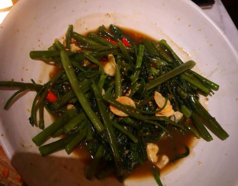 餐厅灯光不是太亮,里面的空心菜油放的太多了,那个黑鲈鱼不错,是特色菜,做的泰国的风味,有点点辣辣的,饮料里面巧克力冰沙不错。