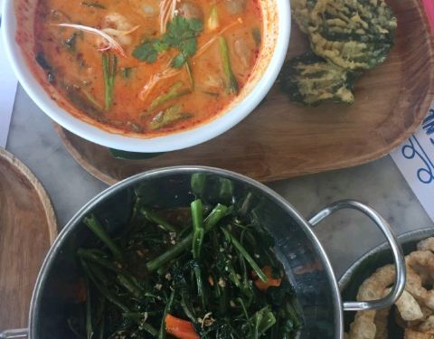 [环境]环境更像是一个咖啡厅,我们坐在沙发座,不过吃饭还是觉得茶几稍微低了一点点。布置的很西式,环境不错 「菠萝饭」菠萝饭真的超好吃,料特别的丰富,有葡萄干,坚果,菠萝,还有大虾,超级超级好吃,我都吃了好几大碗 「泰北拼盘」其实知道这家餐厅是看别人发的图片觉得这个拼盘卖相很好。虽然知道不一定合口味,价钱也不算便宜,还是为了它的颜值点了。里面有四种不同的小菜,第一个是菠萝上面有一块甜甜的东西,整体口感是酸甜。第二个是炸馄饨,是咸咸的脆脆的。第三个是在玻璃杯上面的叶子,里面有小虾米,花生碎和一些不知道是什么的料,里面会舀一些旁边的酱汁进去,吃起来有点薄荷和干果的味道,很特别,第一次值得尝尝。当然了朋友觉得超级美味全吃了,因人而异吧。最后一个是玻璃杯里面有甜甜的酱,里面像炸春卷一样裹了两个大虾,很很好吃 「沙爹鸡肉串」鸡肉串我确实觉得是败笔,肉烤的太老了,即使调的花生酱和甜甜的汁不错,还是难掩柴劲 「胡萝卜水果汁」味道其实很不错,就是量少了点