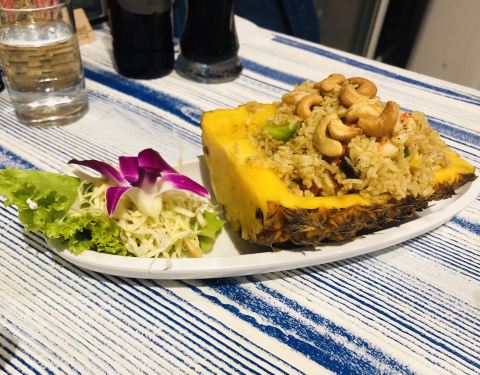 离塔佩门不远,往南大概50米的样子。生意特别好,尤其国人特别多,中国人还可以打九折,支付宝95折。主打泰国菜,点了咖喱蟹(588B)、冬阴功汤(148B)、泰式炒面,青木瓜沙拉,炒空心菜、泰北咖喱面,菠萝炒饭,基本上特色菜一网打尽。确实名不虚传,特别推荐咖喱蟹和菠萝炒饭,味道正宗。芒果沙冰120铢,泰式奶茶60铢。四个人折后花了约1400B,算是很实惠了。如果不想等位,一定要赶早去,中午11点开门。老板是个老外,所以菜单上也有披萨等西餐。