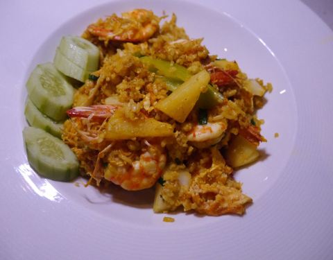 清迈门边的特色小点,泰国菜西餐中餐都有。推荐咖喱虾仁炒饭。虾新鲜,虾线处理干净,配合菠萝咖喱炒饭,米饭弹牙,软硬适中,咖喱也没有过辣。BBQ 酱排骨,用的都是肋骨,包裹着丰富的酱汁,十分下饭。吃不惯重...