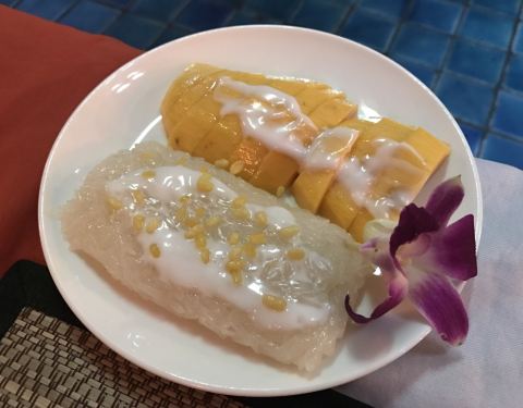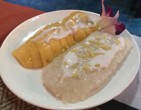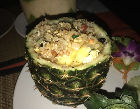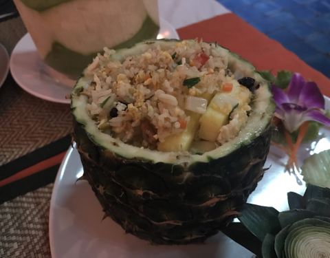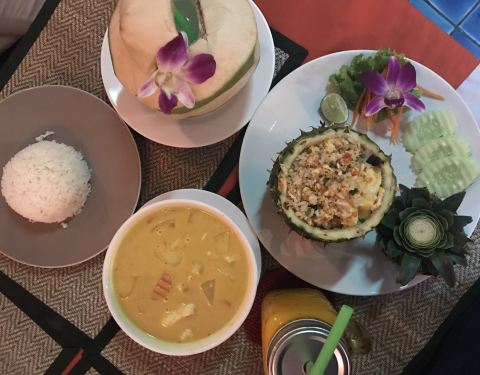 人均150泰铢,黄咖喱牛肉量足,加了好多椰奶,特别浓郁特别下饭,菠萝炒饭里加了很多菠萝、葡萄干和腰果,口感很丰富!芒果冰沙也很好喝,很大一杯50泰铢。