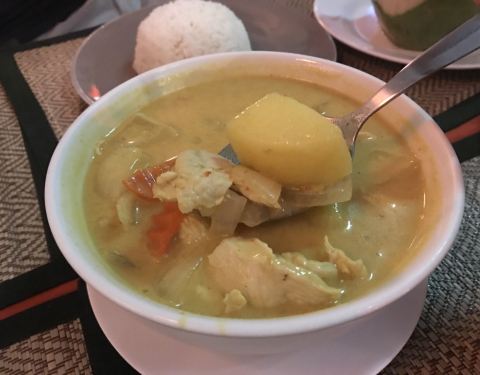 - ...泰国菜,蛮好吃的,但是质量也是比较粗糙哈,肉的用料不是那么好,不过咖喱这种菜,味道好配饭就行了
