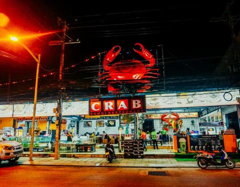 Crab螃蟹之家,位于苏梅岛上著名的查文大街上。门前巨大的螃蟹雕像是他的标志,老远就可以看到。这家的咖喱蟹和澳龙是最有名的,味道做的非常的棒,关键价格很便宜,一顿下来人均不到100块,绝对是假性价比超高的海鲜餐厅。