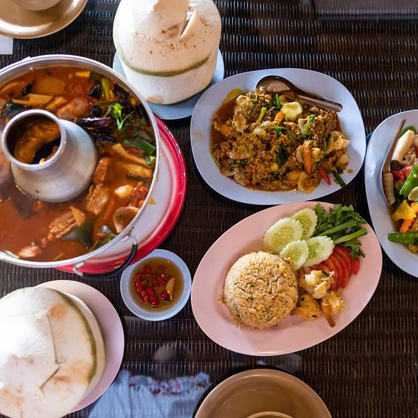 司机说午餐带我们去湄公河上吃饭,这是一家当地特色的餐厅LuLum 。它建在河边,面前的这条河是Mae Kok River,其实它只是湄公河的小小分支,四舍五入我们也算到过湄公河了吧。 餐厅很大,有一部分座位在船上,但是中午的天气很热,我们选择了里面有空调的房间。 这里的冬阴功汤味道很地道,而且特别辣。价格也不便宜,860泰铢。