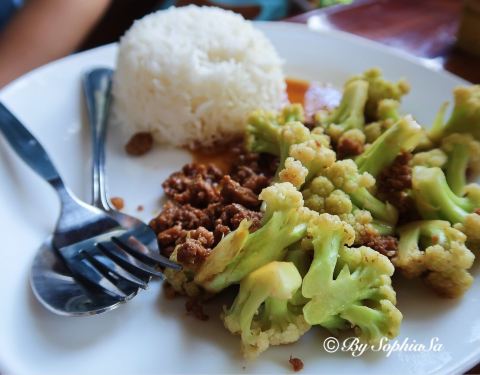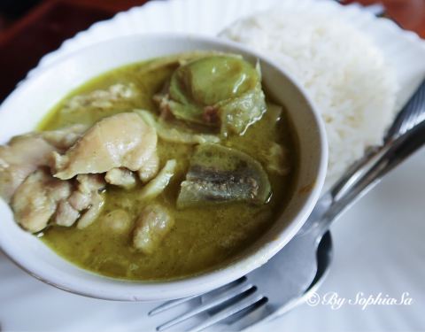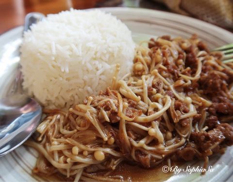 刚好就在清莱黑庙的隔壁,中午又晒又饿地逛完了黑庙,正想休息一下发现了它,开始以为只能喝饮品,后来看到有饭吃实在太高兴。下单的时候服务员提醒饭餐是要等半小时呢,有冷气吹无所谓的~可能平时太多游客在这里借洗手间,它贴了告示说明除了本店消费的客人,借用一人要给10泰铢。再说饭餐,虽然看着像碟头饭,但是味道非常好,无论金针菇炒肉,还是绿咖喱鸡,而且饮品芒果奶昔,菠萝奶昔都很浓郁,最后的甜品芒果糯米饭卖相漂亮,芒果超香甜,伴着香草味道雪糕甜蜜蜜的,女生最爱。