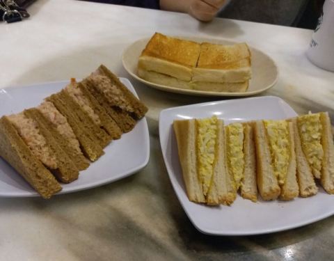 到达吉隆坡的第一餐,就是在机场吃的。马来传统早餐,有卖咖啡和吐司之类的,也有面点。感觉和新加坡的亚坤类似。吐司点了咖椰,鸡蛋色拉和金枪鱼色拉的,面包烤的蛮脆的,咖椰甜甜的,这边特色。咖啡和奶茶有点像港式的风味。