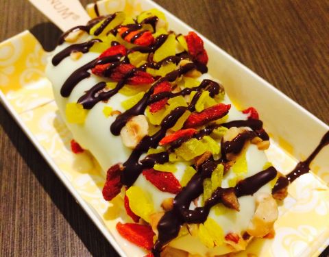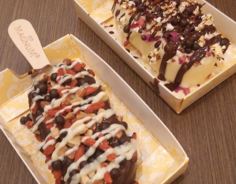 Ling's Magnum. Chocolate brownie ice cream base, white chocolate coating, dark chocolate drizzle, 3 toppings such as goji berries, dried mango, chopped hazelnut. Walla