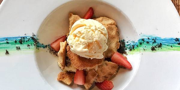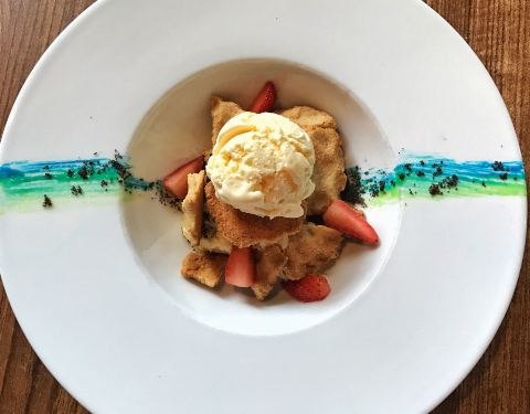 坐落在楼上,风景也很棒,树木郁郁葱葱的,店里的音乐也很棒,有点西部牛仔的风格 土豆饼炸的很酥脆,外酥里嫩的,里面是土豆丝和洋葱丝的结合,所以味道很鲜,炸过的三文鱼排外面的皮很脆,肉质很鲜嫩,适当的蔬...坐落在楼上,风景也很棒,树木郁郁葱葱的,店里的音乐也很棒,有点西部牛仔的风格 土豆饼炸的很酥脆,外酥里嫩的,里面是土豆丝和洋葱丝的结合,所以味道很鲜,炸过的三文鱼排外面的皮很脆,肉质很鲜嫩,适当的蔬菜调味,油腻刚好 摆盘挺美的,有种彩虹的感觉,奶油味的曲奇饼很酥,上面是香草冰淇淋,最下面垫着柠檬味的奖,草莓也掺着里面的味道,虽是摆盘装饰用的奥利奥碎,但是掺着曲奇的味道有种味蕾的惊艳